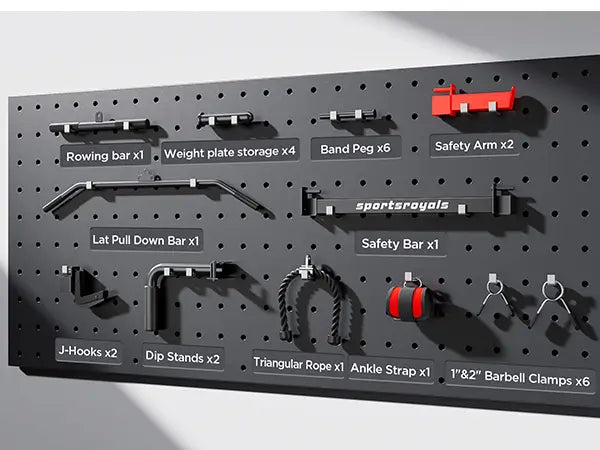No need to buy extra fitness accessories. All come with Sportsroyals home gym power cage. It included: lat pull-down bar*1, cable bar*1, cable handle*2, J-Hook*2, safety frame*2, safety rod*2, wide&narrow pull-up frame, dip bar*2, 360° landmine*1, foot board*1, band peg*6, 1"& 2" barbell clamps*6. In addition, the weight plate storage bracket fits the 2" Olympic or 1" standard weight plates.